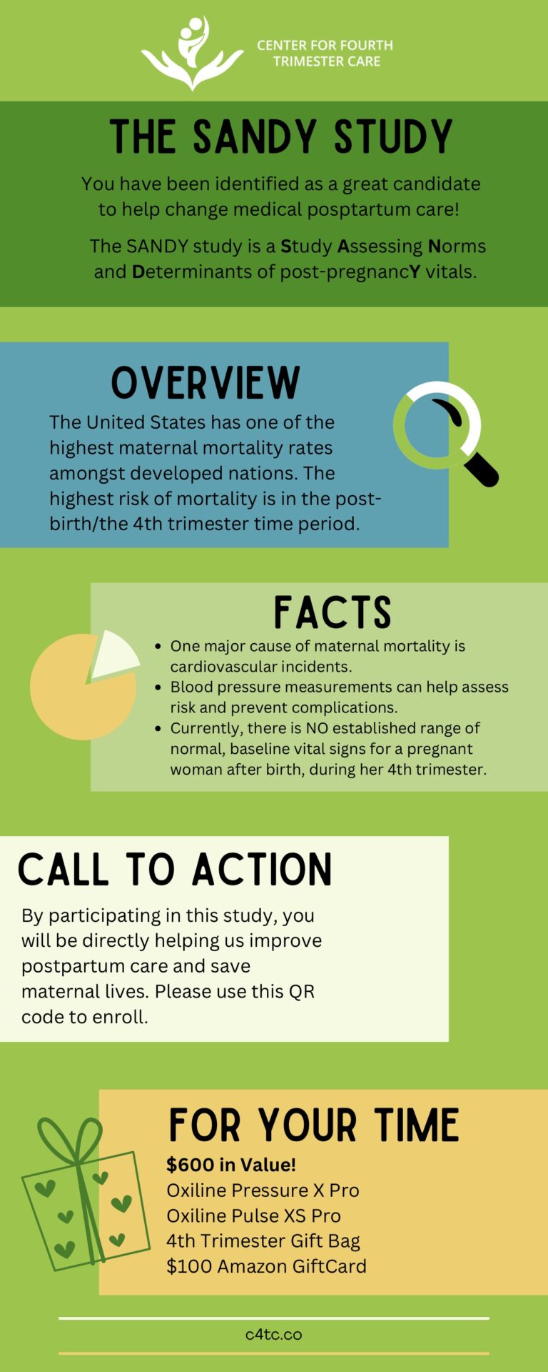 The SANDY (Study Assessing Norms and Determinants of post-pregnancY vitals) study aims to better understand blood pressure, heart rate, and oxygen saturation in mothers during the postpartum period (4th Trimester). We are studying natural changes in blood pressure in the first 42 days after delivery, and your participation could help shape future care standards for postpartum moms.